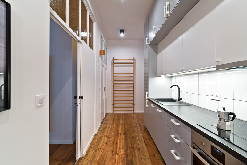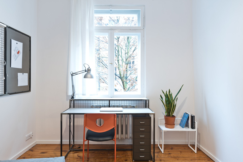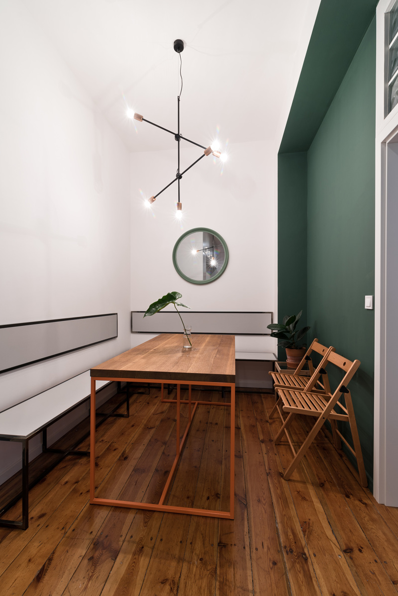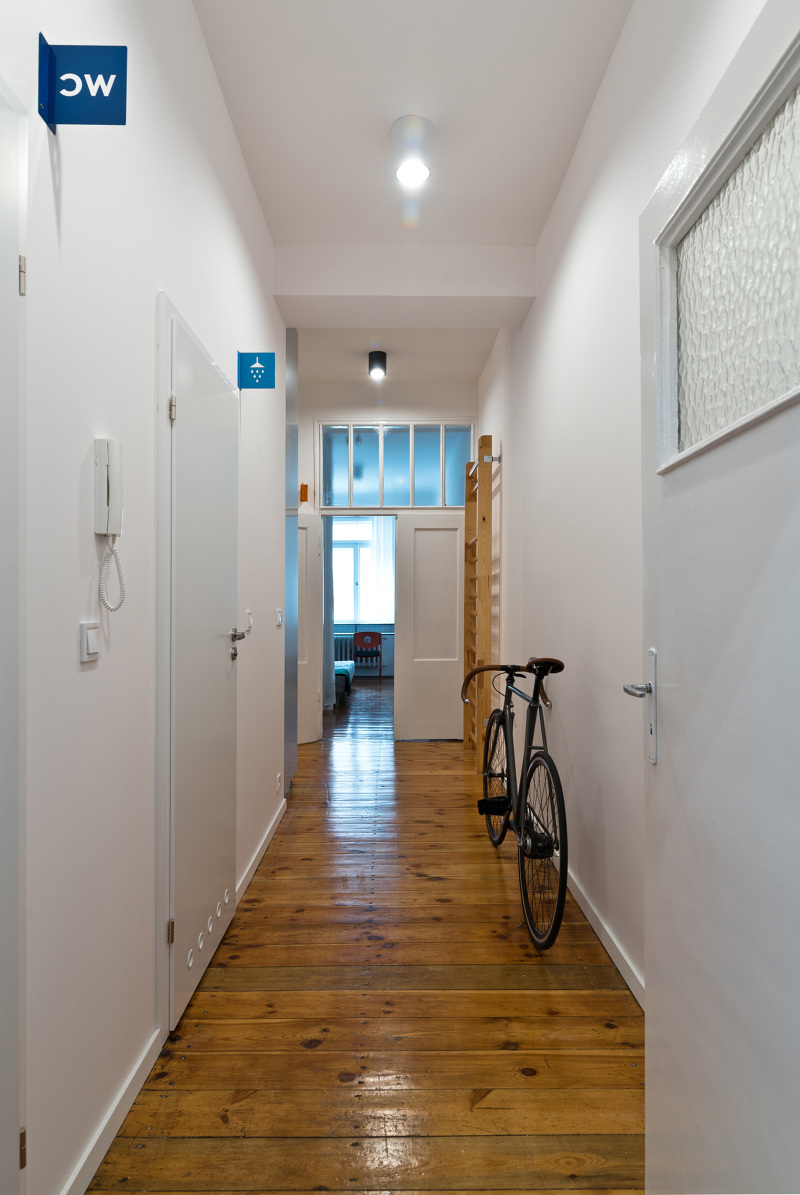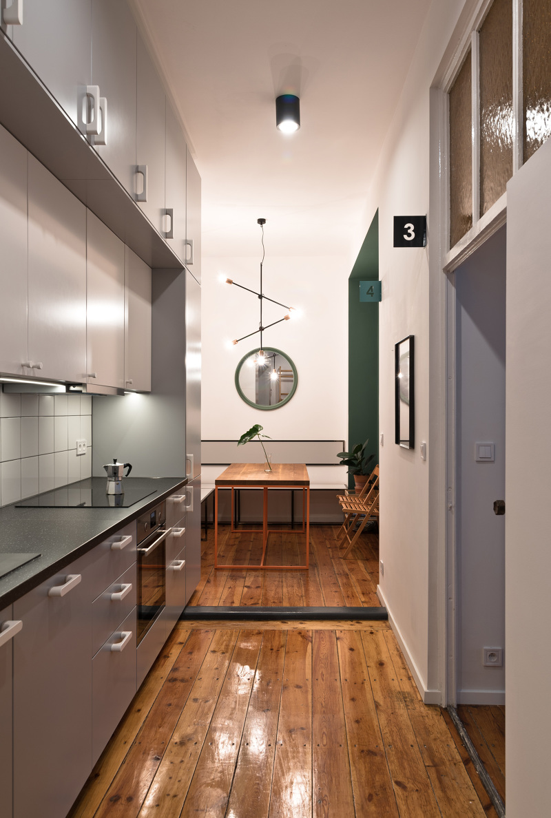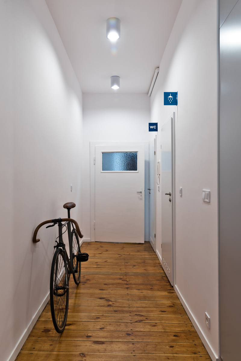 Mieszkanie dla studentów mieści się w kamienicy z lat 30 w samym centrum Poznania. Ze względu na przeznaczenie miejsca, 83 m2 podzielone zostały na 4 niezależne pokoje, część wspólną – kuchnię z jadalnią umieszczone w dużym korytarzu łączącym sypialnie oraz dwie łazienki. W pokojach zbudowano garderoby - ukryte za zasłonami tworzą pojemną przestrzeń do przechowywania, a dodatkowo stanowią przegrodę akustyczną między strefą sypialni, a korytarzem. Część mebli - biurka połączone z osłonami na grzejniki, tablice, małe stoliki, stół jadalny z ławami do kompletu oraz stelaże umywalek w łazienkach zostały zaprojektowane specjalnie do tej przestrzeni. Żeby podkreślić charakter mieszkania na wynajem, we wnętrzu pojawiły się elementy identyfikacji – znaczki z numerami pokojów oraz symbolami łazienki i toalety. W części wspólnej stanęła oryginalna drabinka gimnastyczna, która wpisuje się w studencki klimat miejsca.