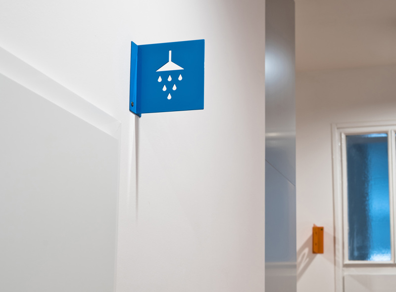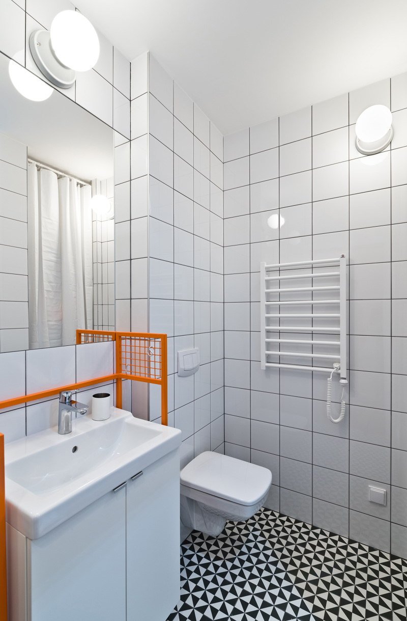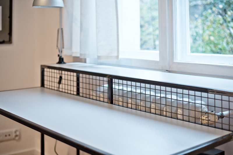 Some of the furniture like desks combined with radiator covers, small tables, magnetic boards, dining table and benches have been designed specifically for this space. To highlight apartment’s rental character in the interior appeared identification elements - room numbers and symbols of bathroom and toilet. In the common part you can find original gymnastic ladder that fits perfectly to the students apartment theme plus can be very useful.