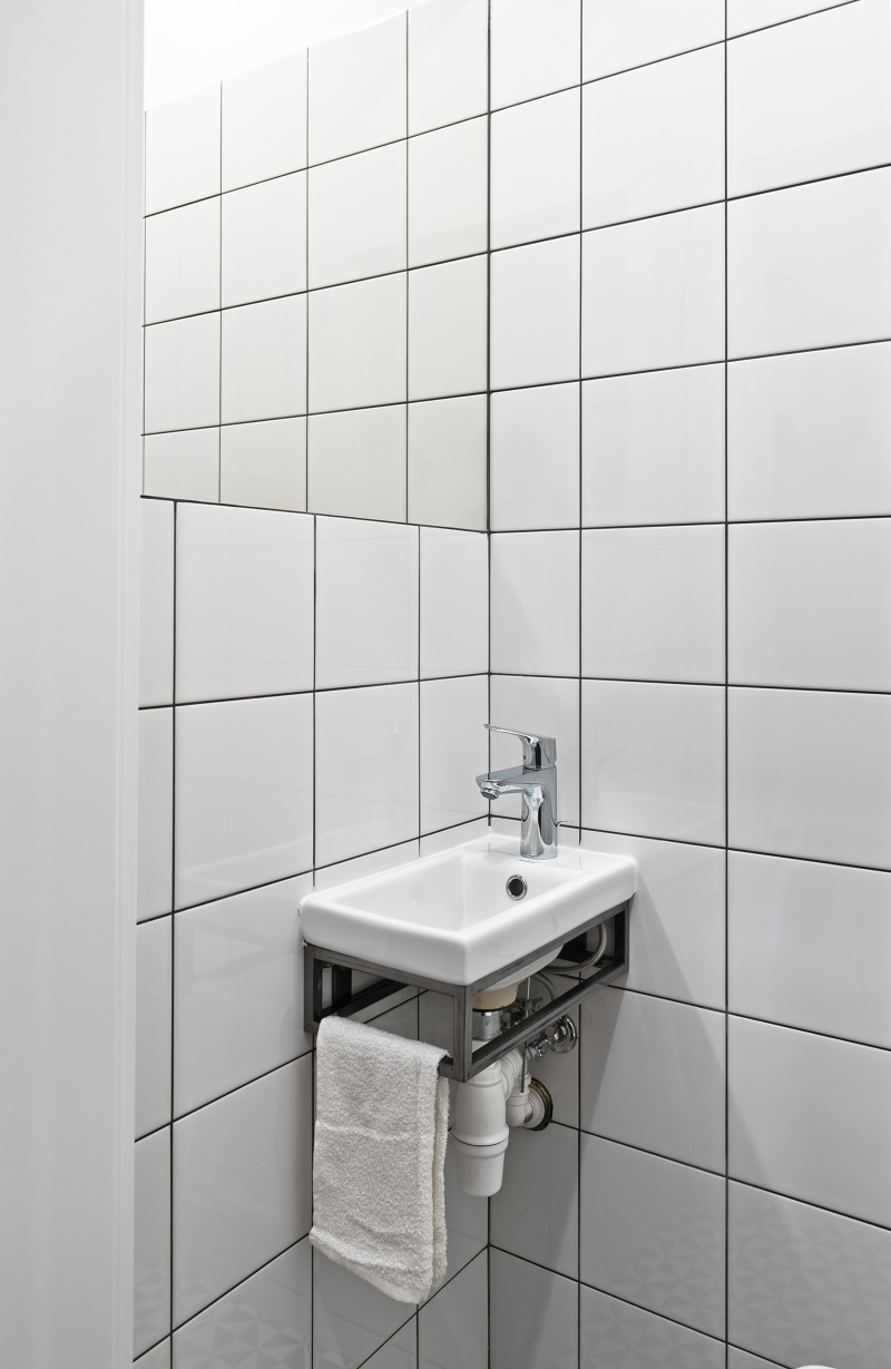 W mieszkaniu zostały zachowane oryginalne elementy wnętrza – drzwi z naświetlami, skrzynkowe okna i drewniana podłoga, stąd jego kolorystyka ogranicza się do białego i szarego koloru, który uwydatnia cenne fragmenty z lat 30.