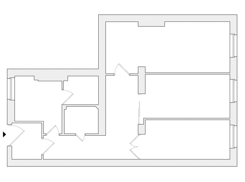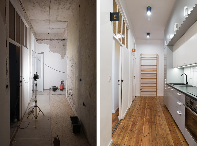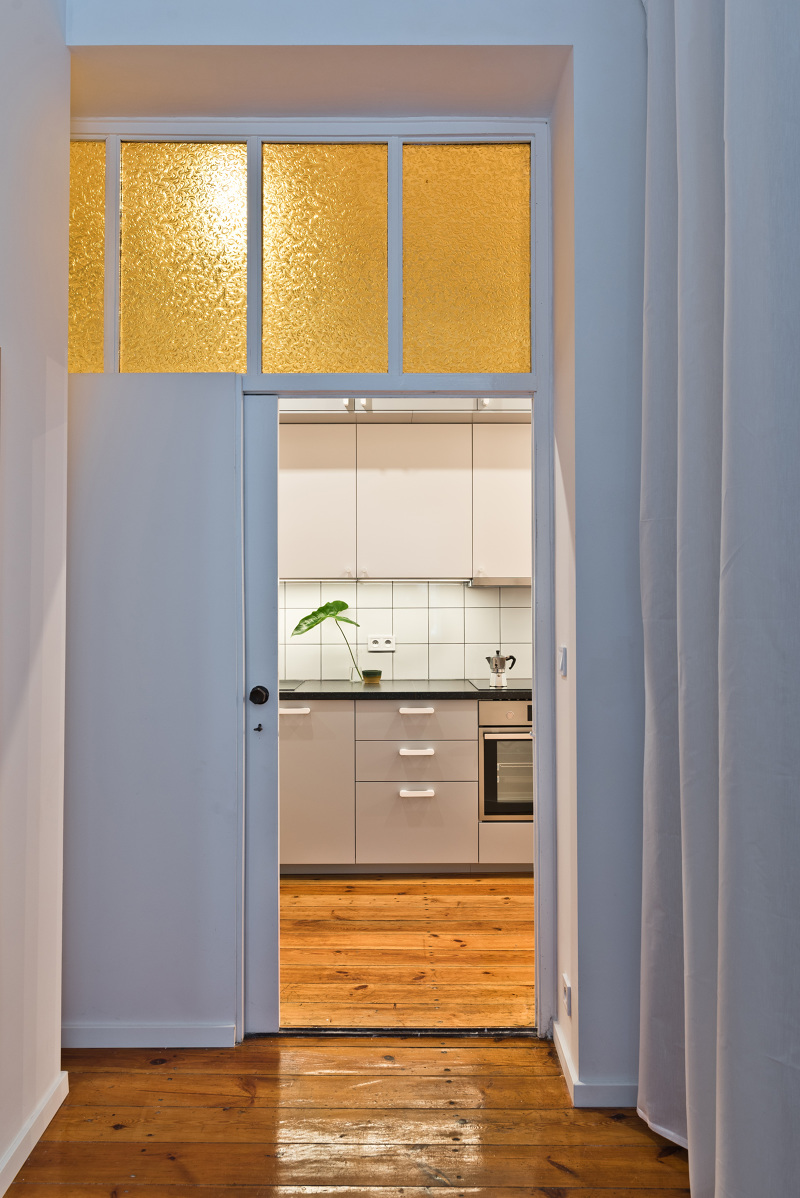 Original elements of this apartment like doors with transoms, casement windows and wooden floor were carefully preserved hence interior color is limited to white and gray that highlights the valuable pieces from the 30s.