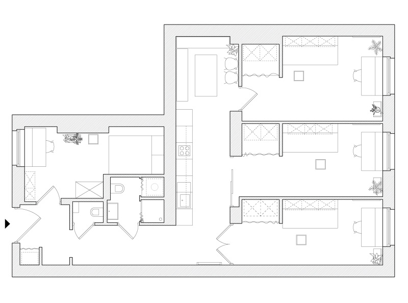 Students apartment is placed in 30s building in the center of Poznan. Because of its purpose, 83 sq. meters were divided into 4 independent rooms, a common space – kitchen and a dining area placed in a spacious corridor, bathroom and a toilet. Each room has its own build-in wardrobe, hidden behind curtain, that is not only a spacious storage but also separates sleeping area from the corridor.