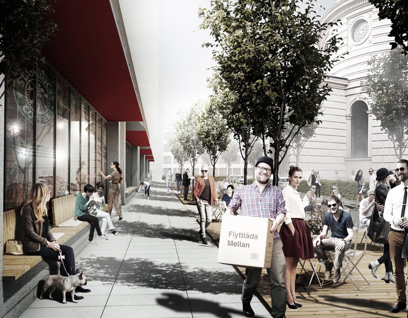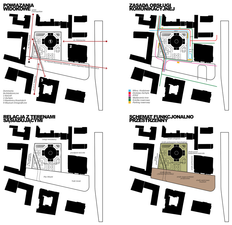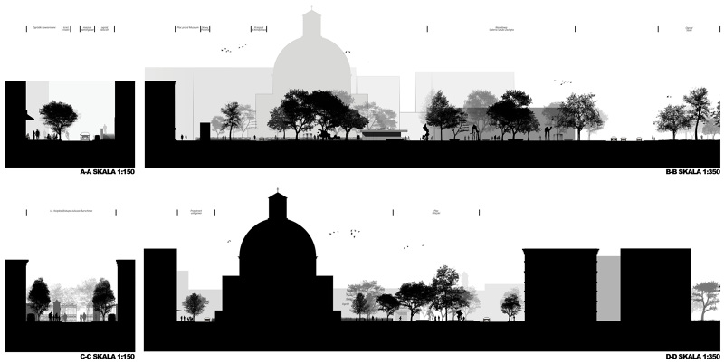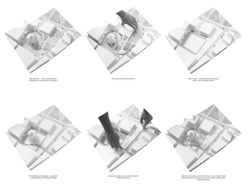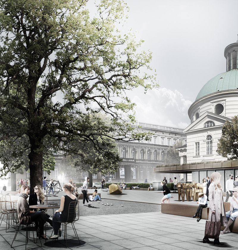 Projekt przewiduje podzielenie omawianego obszaru na dwie główne strefy. Strefę podłużnego placu wzdłuż ulicy Mazowieckiej oraz kwadratową strefę francuskiego ogrodu geometrycznego otaczającą kościół. Zależało nam na zlikwidowaniu istniejących, niepotrzebnych barier i podziałów, dlatego zaprojektowaliśmy Plac, który rozpoczyna się stykiem z ulicą Królewską a kończy pod Muzeum Etnograficznym i w całości pokryty jest kamienną posadzką, przez którą w nieregularnym układzie „przerastają” drzewa. Plac ma się stać żywą przestrzenią goszczącą ludzi, światło, cień, wodę oraz sztukę. Przewidujemy iż będzie to przestrzeń, która znakomicie sprawdzi się jako: kontynuacja przestrzeni ekspozycyjnej Galerii Narodowej (czyniąc sztukę bardziej dostępną i otwartą), miejsce na kiermasze, spotkania oraz inne aktywności społeczne.