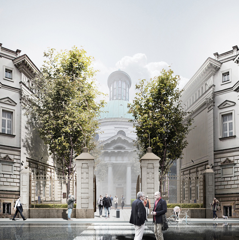 Wokół kościoła zaprojektowaliśmy ogród. Przestrzeń inną, wyciszoną i szlachetną, która ma podkreślić specyfikę miejsca jakim jest świątynia. Aby zaznaczyć wagę tego budynku, proponujemy odtworzenie historycznej osi prowadzącej od Fontanny Saskiej do wrót Kościoła św. Trójcy. Koncepcja przewiduje wyrównanie wysokości budynków po obu stronach osi oraz rekonstrukcję historycznej bramy wraz z murem od strony ulicy Królewskiej. W nawiązaniu do pierwotnego wyglądu Ogrodu Saskiego z lat 1724–1748, zielony obszar otaczający kościół zaprojektowany jest jako geometryczny ogród francuski.