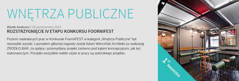 Projekt ŹRÓDŁO.BAR zdobył nagrodę główną w konkursie Foornifest 2015 w kategorii wnętrza publiczne! /