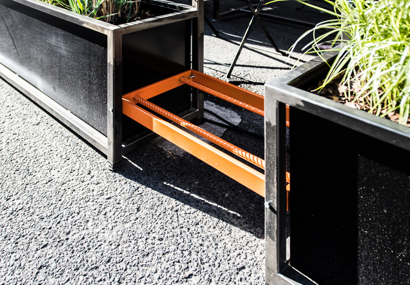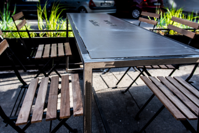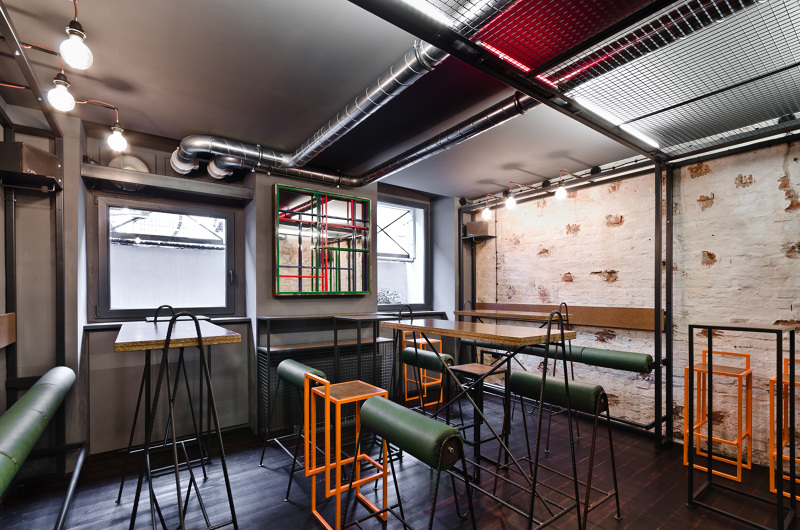 Bar was completed with two sets of furniture : bar stools with tables and trestle seats and tables made of rebar.