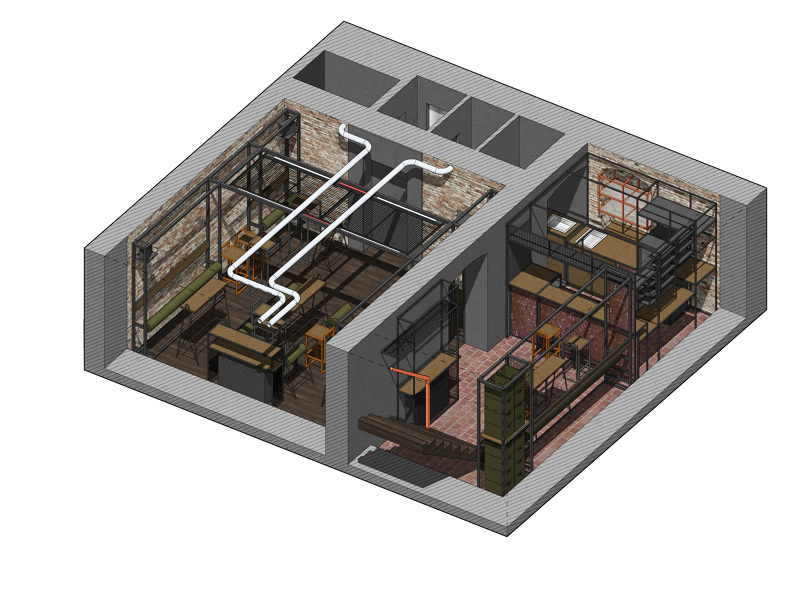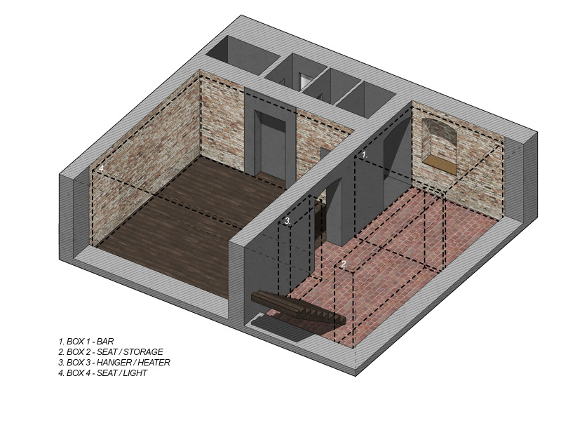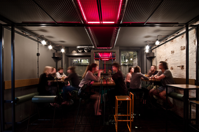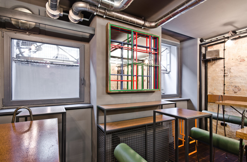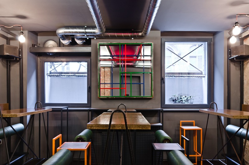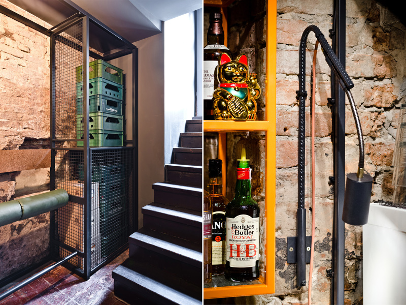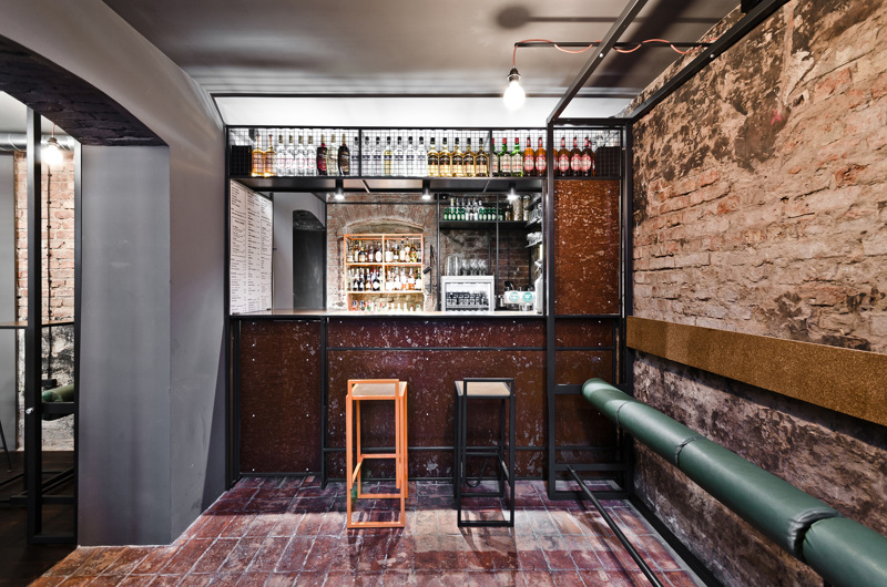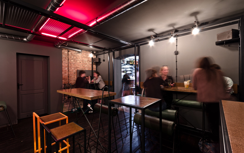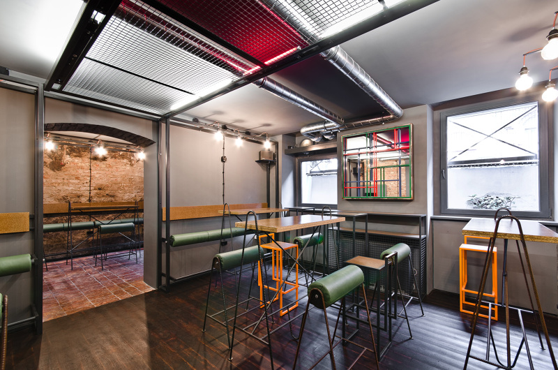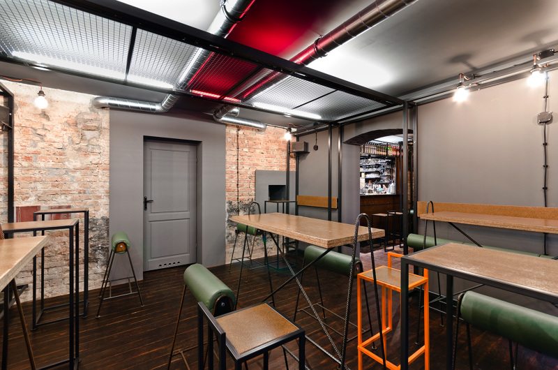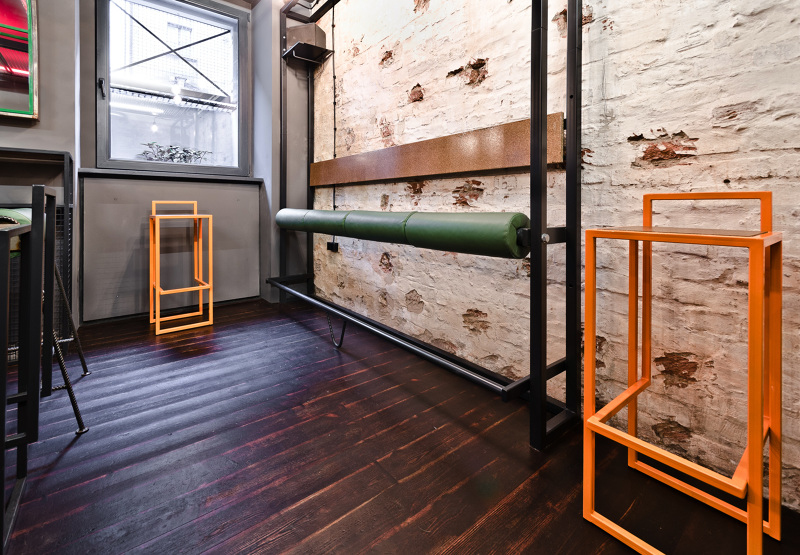We placed three steel structures inside the bar – these are boxes holding all of the elements like seatings and lighting. None of the elements, except surface-mounted electrical installation, has been screwed into original walls.