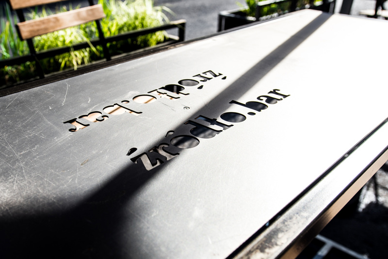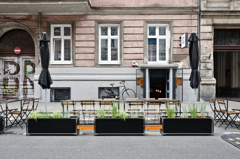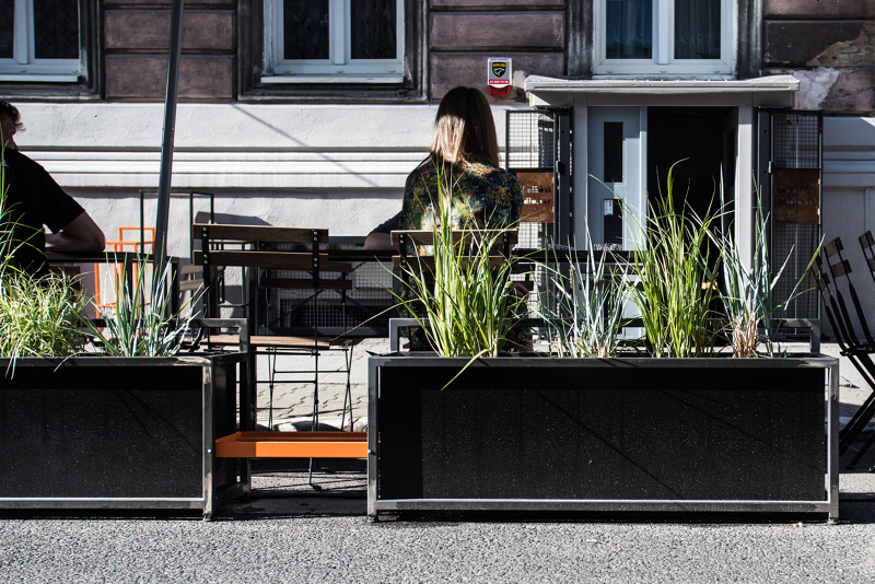 During summer, some of parking spaces of Taczaka street are turned into cafes gardens. We wanted garden of Źródło.bar to be an announcement of its interior, thats why tables and plant pots were also designed individually.