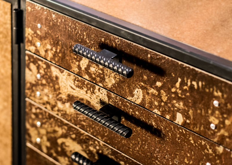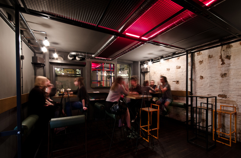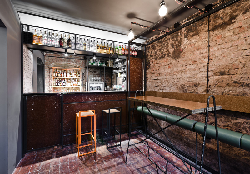 W sali wejściowej, na przeciwko drzwi do lokalu, stanęło stalowe pomieszczenie - bar. Wykonany został ze stalowych profili i siatki oraz zardzewiałych blach, a jego blaty pokrywa surowa płyta MDF. Pomimo niewielkiej powierzchni, w barze udało się wygospodarować wiele miejsca do przechowywania i eksponowania alkoholu i sprzętu barowego.