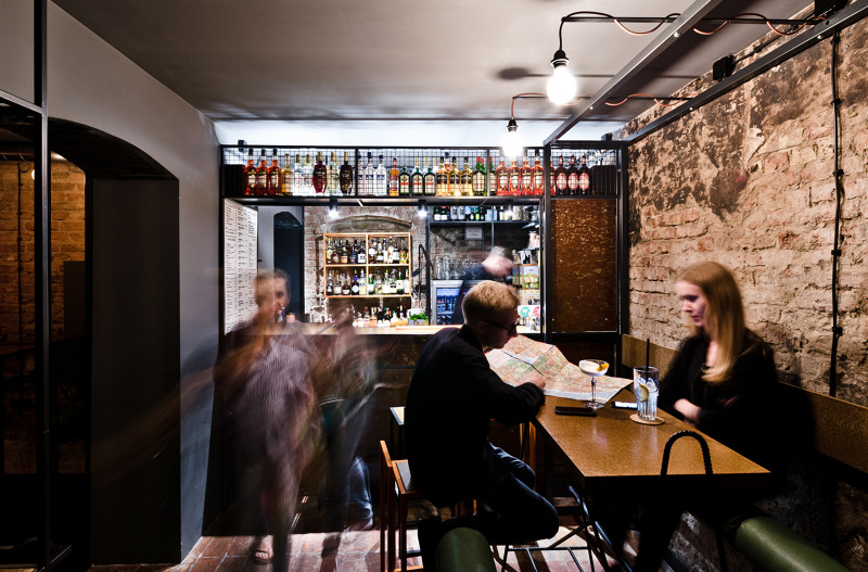 Źródło.bar to nowy bar z whisky na mapie Poznania. Lokal znajduje się w piwnicy starej kamienicy przy jednej z najmodniejszych ulic z restauracjami i kawiarniami w centrum miasta - ulicy Taczaka. Zastane miejsce stało puste przez kilka lat stąd lokal był w bardzo złym stanie. Po uporządkowaniu całej przestrzeni ukazały się nam oryginalne ściany z cegły oraz wyjątkowa ceglano-drewniana podłoga. Głównym założeniem było pozostawienie pierwotnego stanu miejsca i dodanie do niego nowej, niezależnej tkanki. Razem z inwestorem ustaliliśmy, że każdy element wnętrza, łącznie z meblami i oświetleniem zostanie zaprojektowany indywidualnie – chcieliśmy ograniczyć stosowanie gotowych produktów.