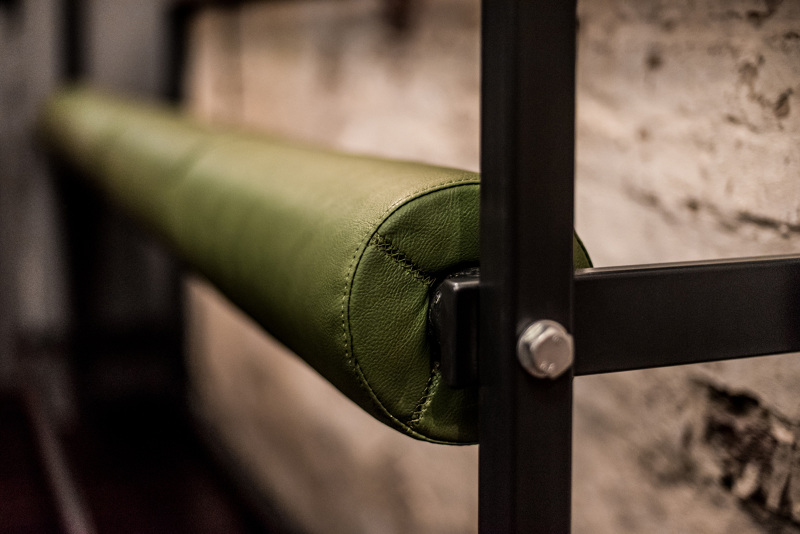 Po prawej stronie od wejścia mieści się druga stalowa konstrukcja, która pełni funkcję siedziska i przechowalni skrzynek z butelkami. Siedzisko to zaprojektowany przez nas wałek z ekoskóry z oparciem. Wykonaliśmy wiele prób z tapicerem zanim otrzymaliśmy odpowiednio twardy i jednocześnie wygodny mebel. Do górnych profili ramy przykręcone zostały stalowe płaskowniki, z których zwisają żarówki oświetlające wnętrze.