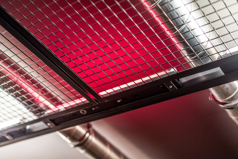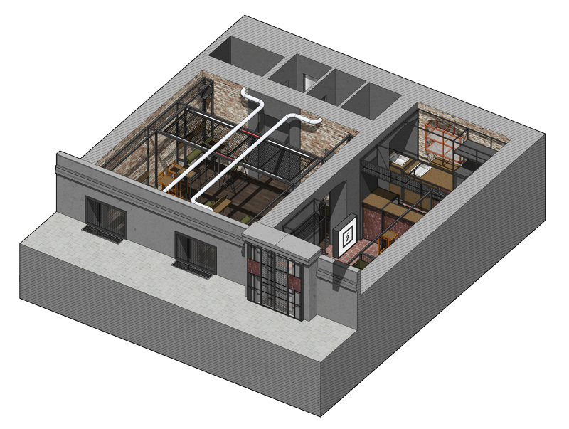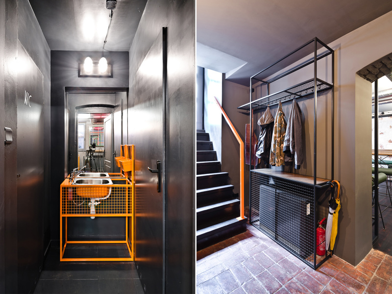 We wnętrzu umieściliśmy trzy stalowe konstrukcje - boksy, na których opierają się wszystkie elementy takie jak siedziska i oświetlenie. Żaden z elementów, poza natynkową instalacją elektryczną, nie został wkręcony w oryginalne ściany. Zastosowaliśmy stonowaną grafitową kolorystykę z pomarańczowymi akcentami, które nie konkurują z mnogością materiałów i intensywnym kolorem cegły zastanego wnętrza.
