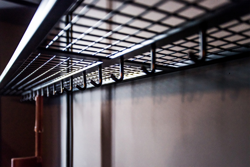 In the entrance room, opposite main door, there is first steel box – the bar. It was made of steel profiles and nets, rusted metal and raw MDF which covers bar tops. Despite it's a small space, bar has lots of place for storage and display of alocohol and bar equipment.