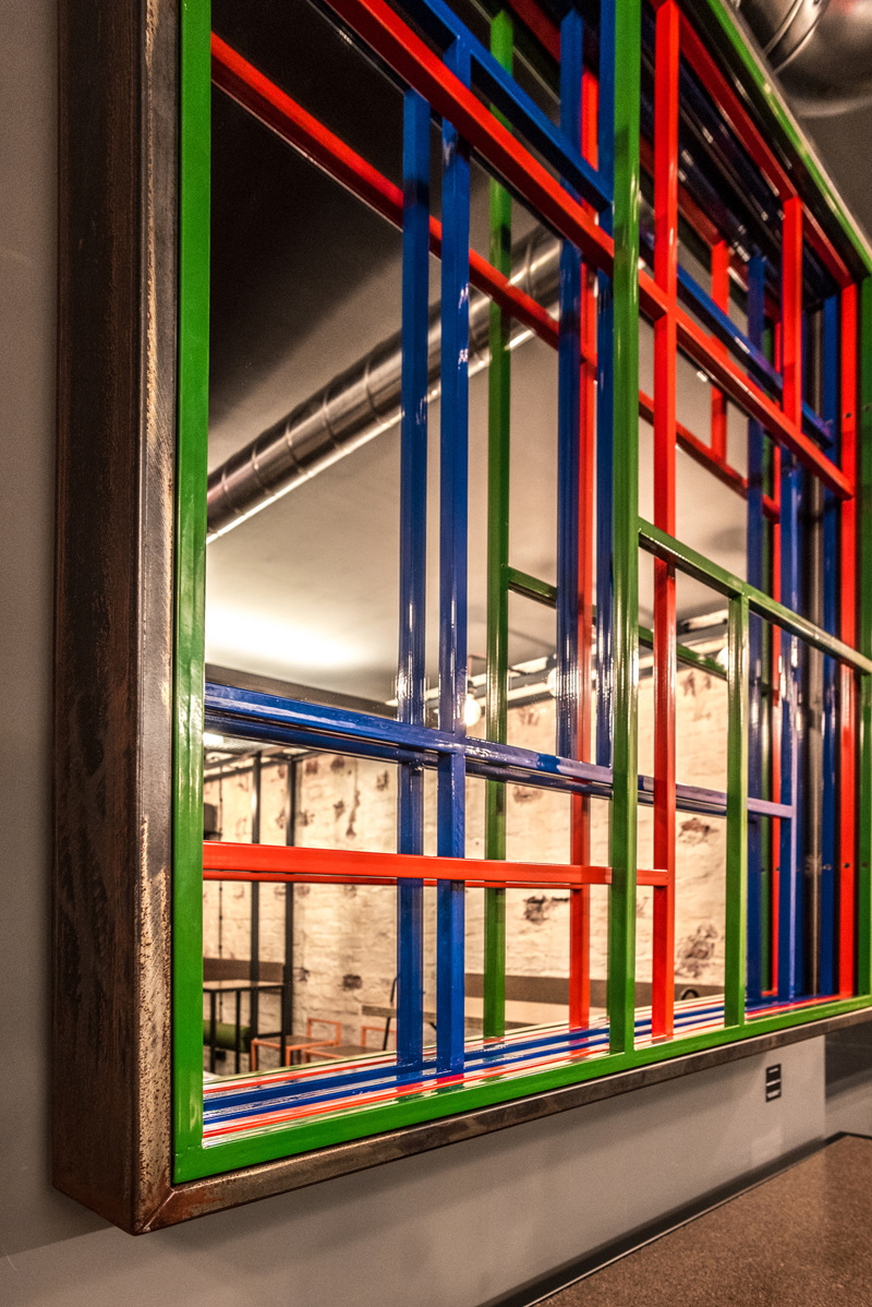 W drugiej sali mieści się największa konstrukcja - ramy z siedziskami połączone ze sobą stalowym "mostem" z siatką i świetlówkami, który umieszczony na linii dawnych drzwi, podkreśla przejście pomiędzy pomieszczeniami. Pomysł z wałkami w ramach wygenerował wiele miejsc siedzących przy ścianach, nie zabierając miejsca w lokalu. W tym pomieszczeniu znalazło się także lustro naszego autorstwa, które tworzy przestrzenną strukturę i jako jedyne spośród elementów wyróżnia się intensywnymi kolorami.
