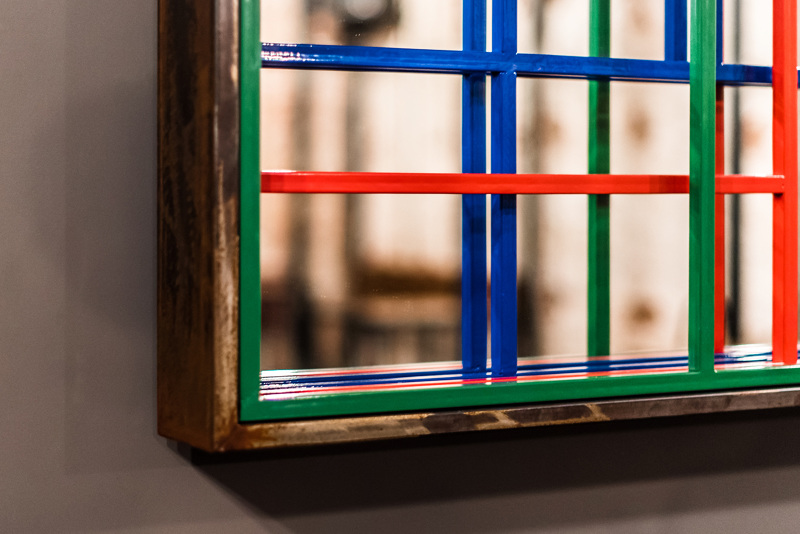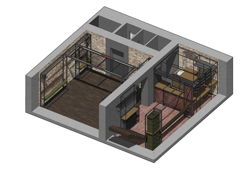 In the second room, there is the largest construction – frame with seats conntected together by steel „bridge” with net and lights. „Bridge” is placed on the line of former door, it highlights the transition between rooms. The idea of rollers attached to frames has generated lots of place. In this room, there is a mirror that we also designed, which creates a spatial structure and is the only one object that stands out with intense colors.