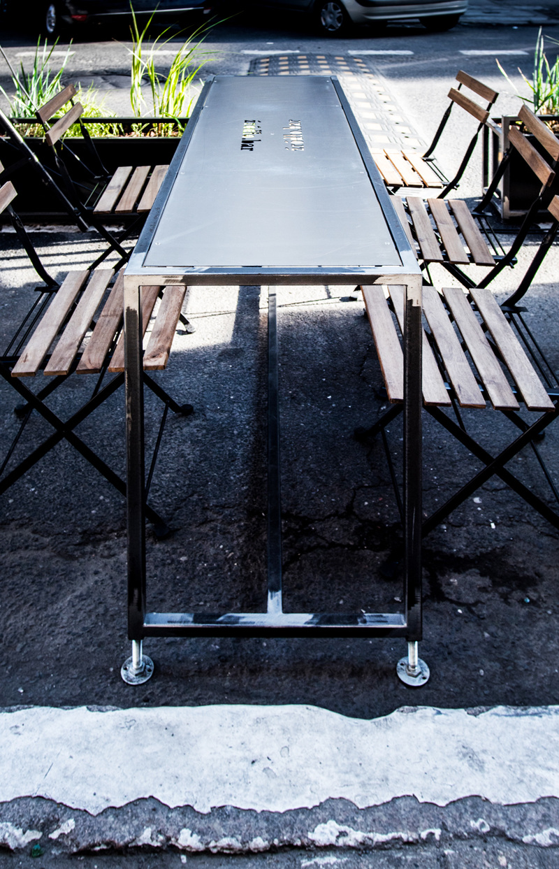 W sezonie letnim część miejsc parkingowych przy ul. Taczaka zamienia się w kawiarniane ogródki. Chcieliśmy żeby ogródek Źródła stał się jego wizytówką, dlatego tak samo jak we wnętrzu, również tutaj najważniejsze elementy – stoły oraz donice na rośliny zostały zaprojektowane indywidualnie.